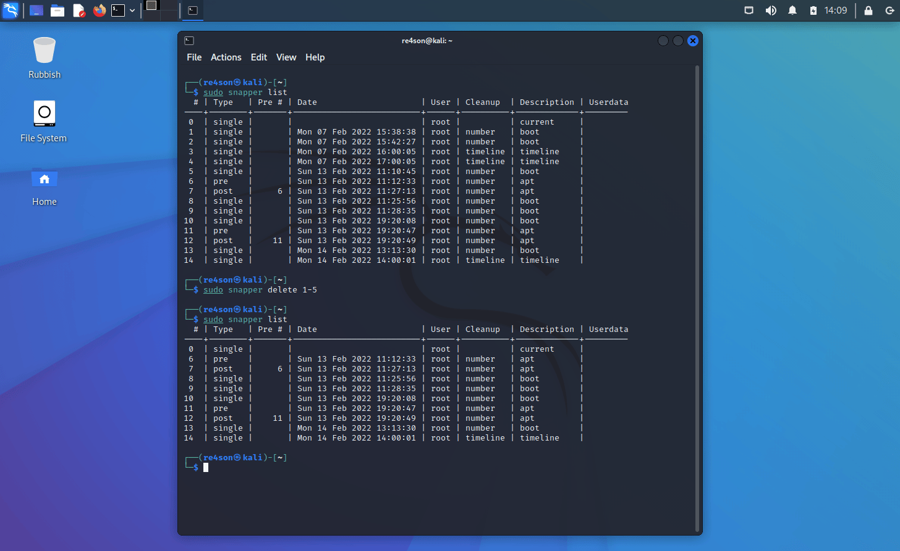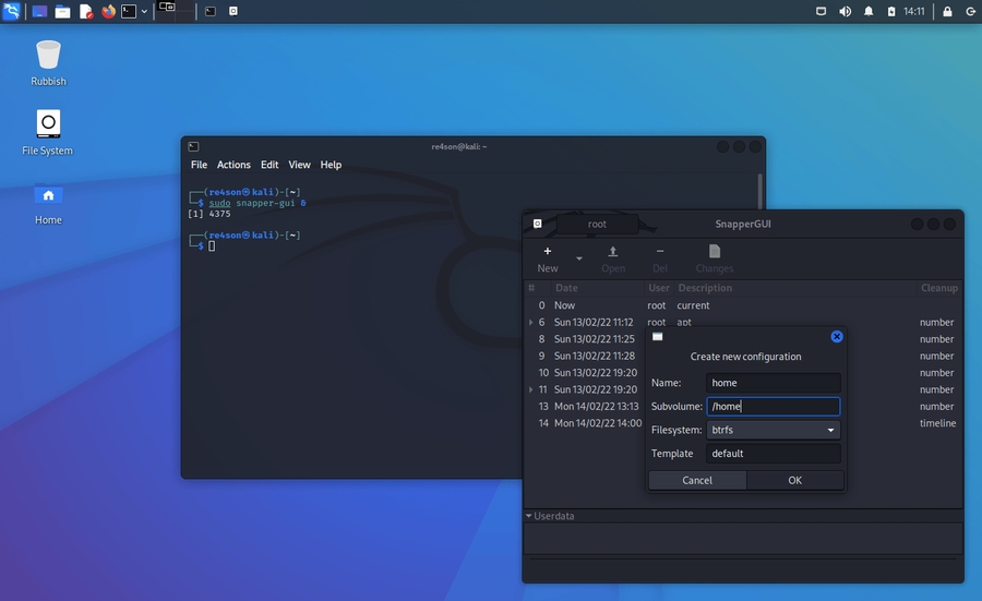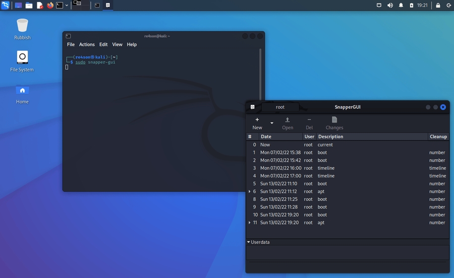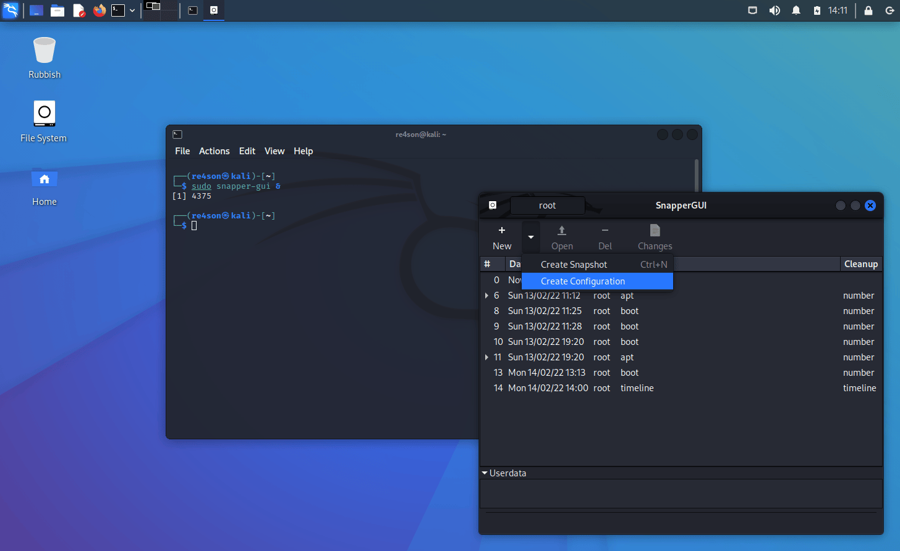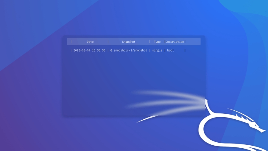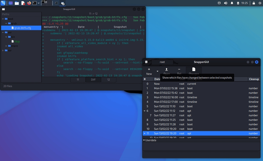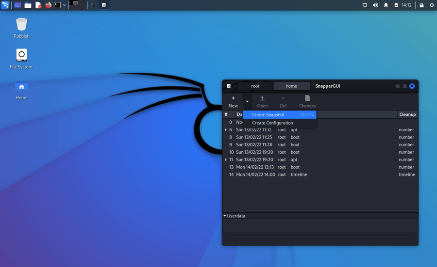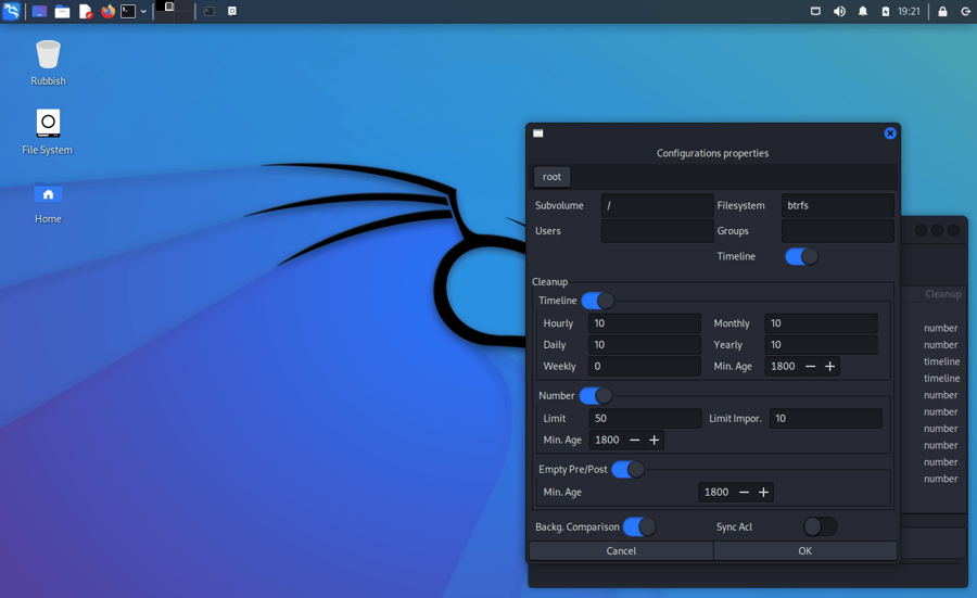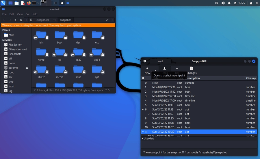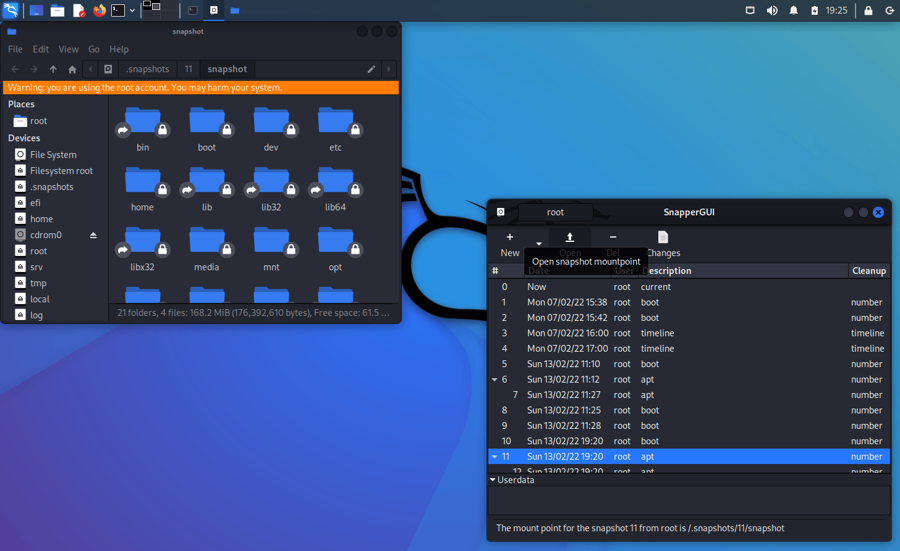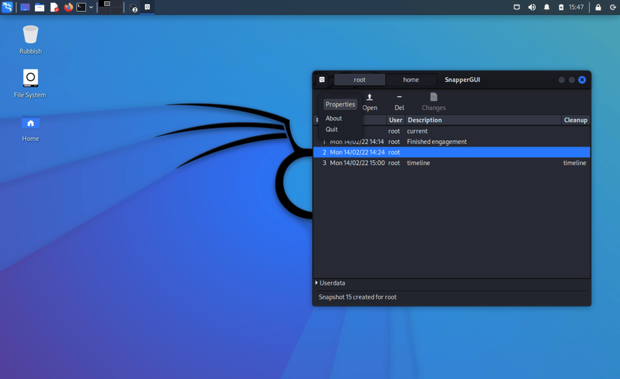 Out of the box Kali creates snapshots of the root directory to allow system rollbacks. Snapshots are automatically created during apt operations, at specified time intervals, and on every boot. The configuration can be changed via the “snapper-gui” tool. Just click on the little icon in the top left hand corner and select “Properties”: