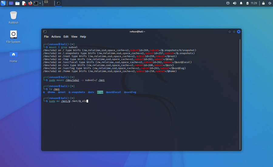 Before we replace the current root with our snapshot, let’s move “@” away just to be safe: