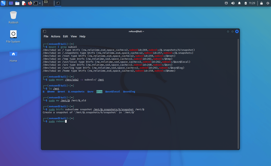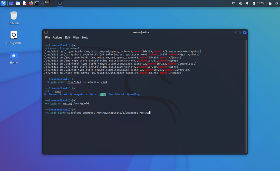 Remember that “/” itself is the subvolume “@”. To rollback to a snapshot, all we have to do is replace “@” with the snapshot we want.