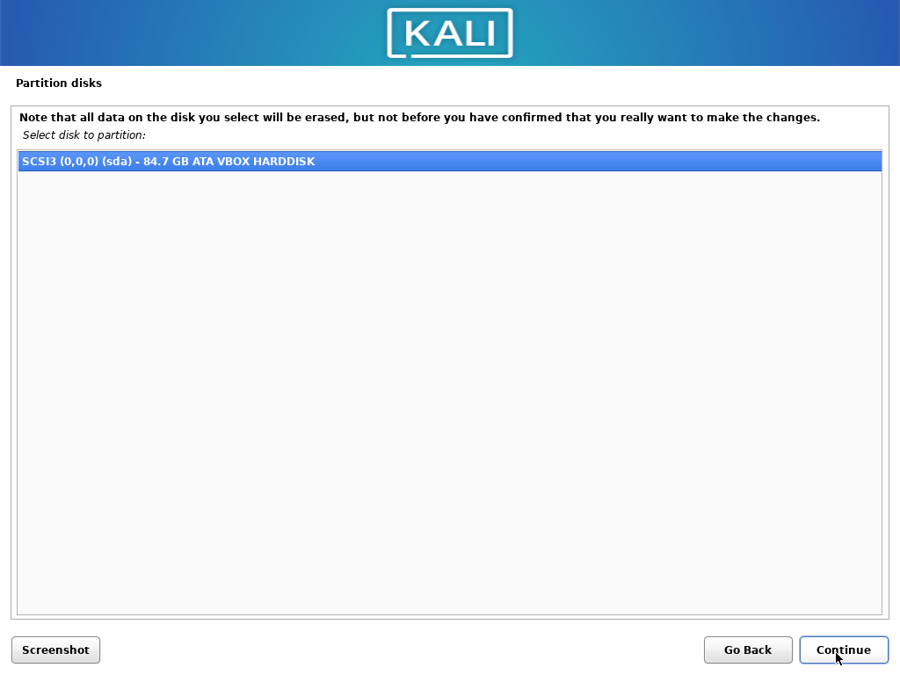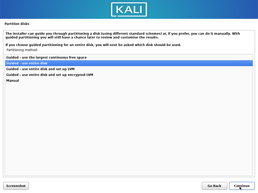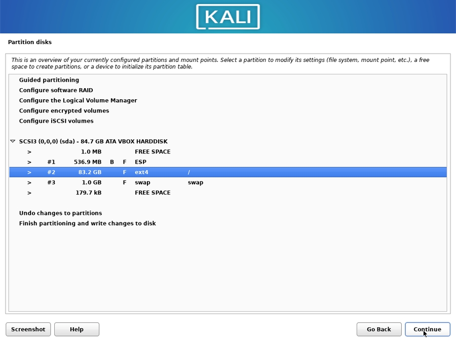 Installing Kali Linux with snapshotting functionality is very similar to a standard installation except that we install it with btrfs as file system.