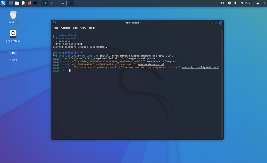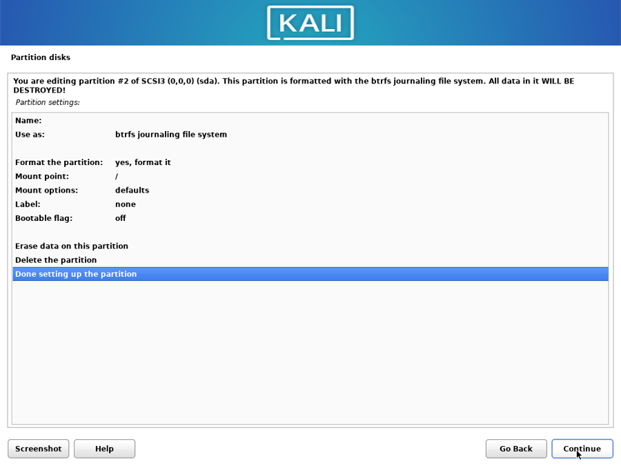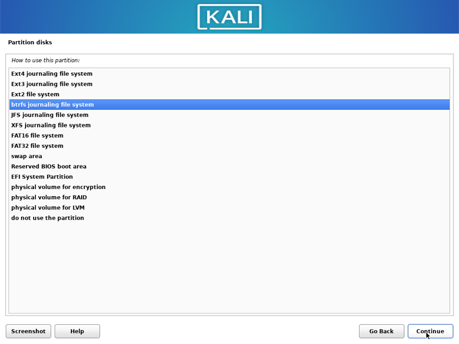 The installation steps are identical to a default Kali installation except changing “ext4” to “btrfs” as file system: