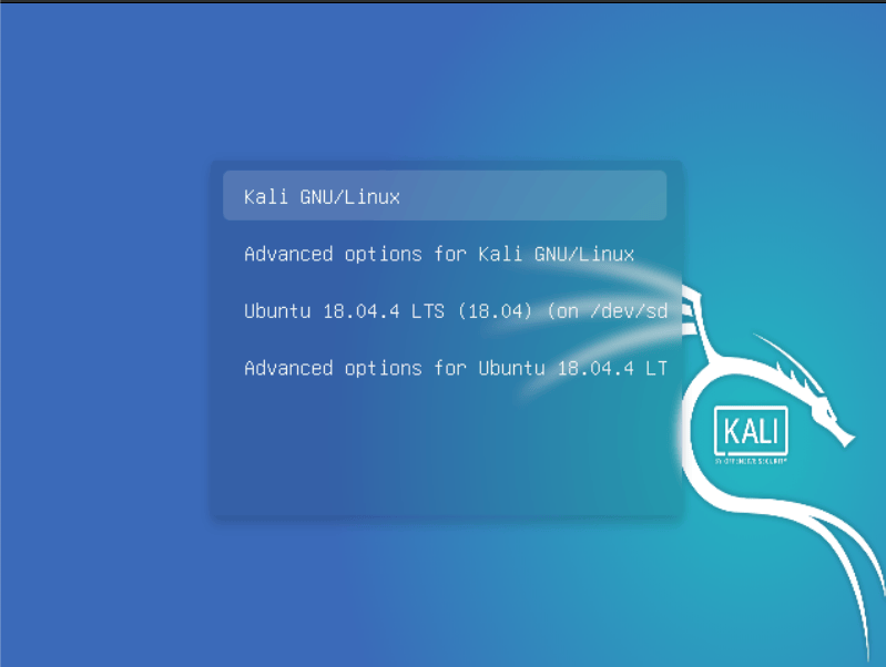 You should be greeted with a GRUB boot menu, which will allow you to boot either into Kali Linux or the other Linux operating system.