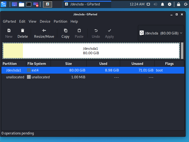 Now launch GParted, which we’ll use to shrink the existing Linux partition to give us enough room to install Kali Linux in the free space.