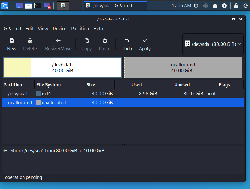 Once you have resized your Linux partition, ensure you “Apply All Operations” on the hard disk. Exit gparted and reboot.