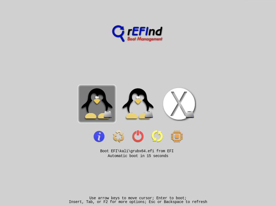 rEFInd is also included with Kali Linux. We can quickly install it by doing the following:
