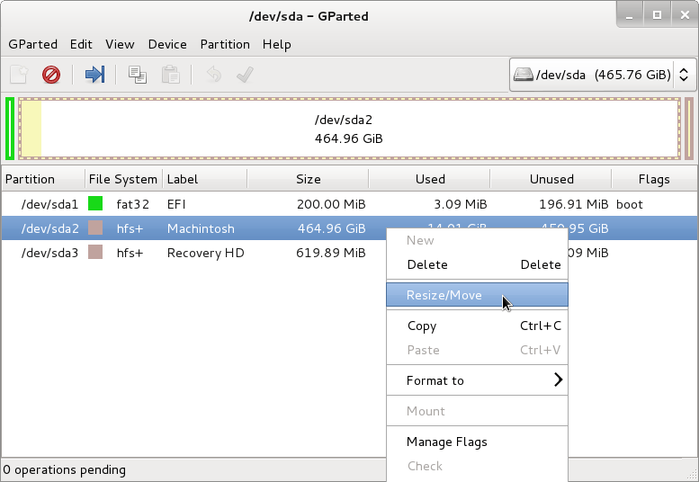 Once you have resized your macOS/OS X partition, ensure you “Apply All Operations” on the hard disk. Exit gparted and reboot.