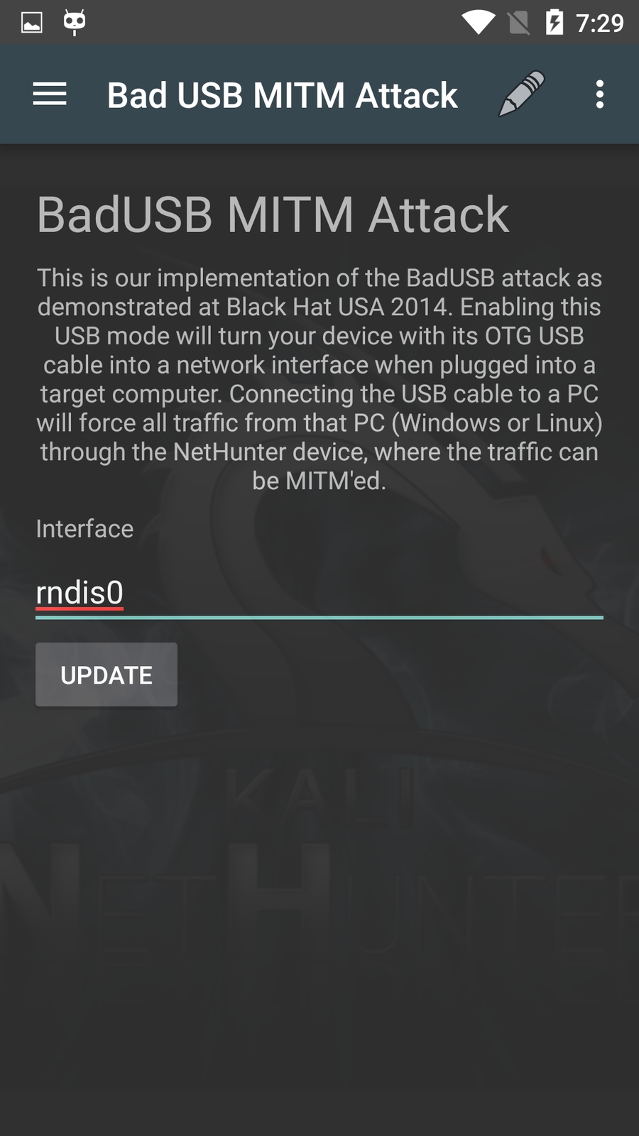 This is our implementation of the BadUSB attack as demonstrated at Black Hat USA 2014. Enabling this USB mode will turn your device with its OTG USB cable into a network interface when plugged into a target computer. Connecting the USB cable to a PC will force all traffic from that PC (Windows or Linux) through the NetHunter device, where the traffic can be MitM’d.