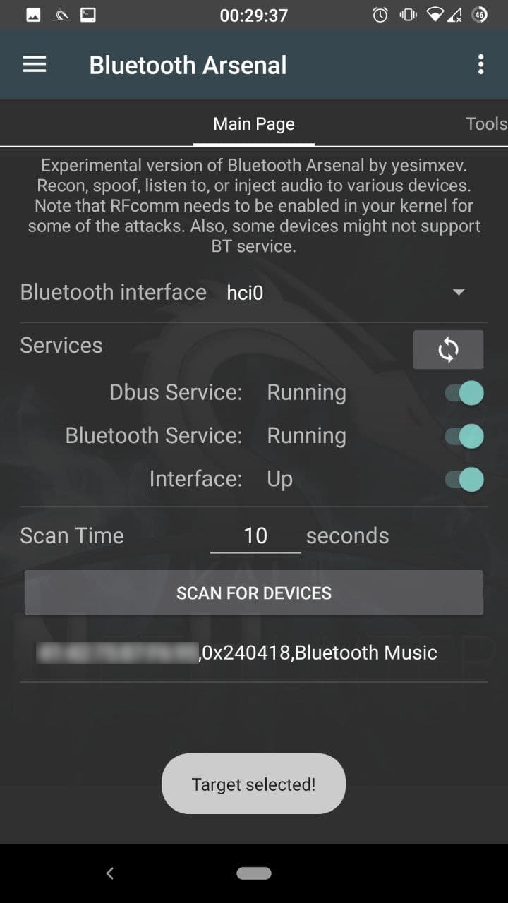 Connect your bluetooth adapter(s) via OTG if you haven’t done so, and press the refresh icon to have them in the spinner menu. Enable dbus, bluetooth services, and bring up the adapter (hci0) using the switches. If you select a second adapter (hci1), tap refresh again, and bring up that one too with the interface switch. Select the required interface for scanning in the spinner. Enter your scan time if 10 seconds is not ideal. You are ready to scan, press “SCAN FOR DEVICES”. If any found, tap on it, so it will be selected for later usage.