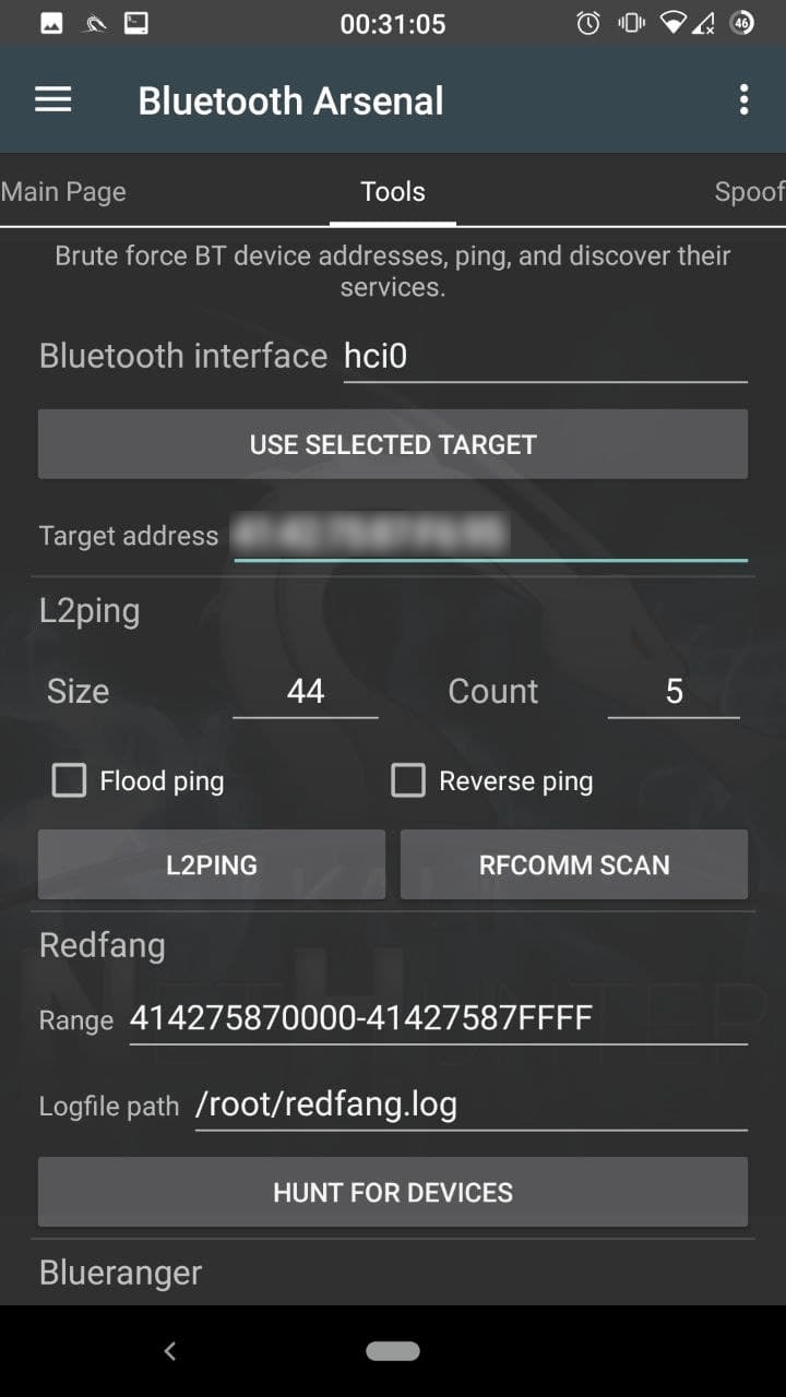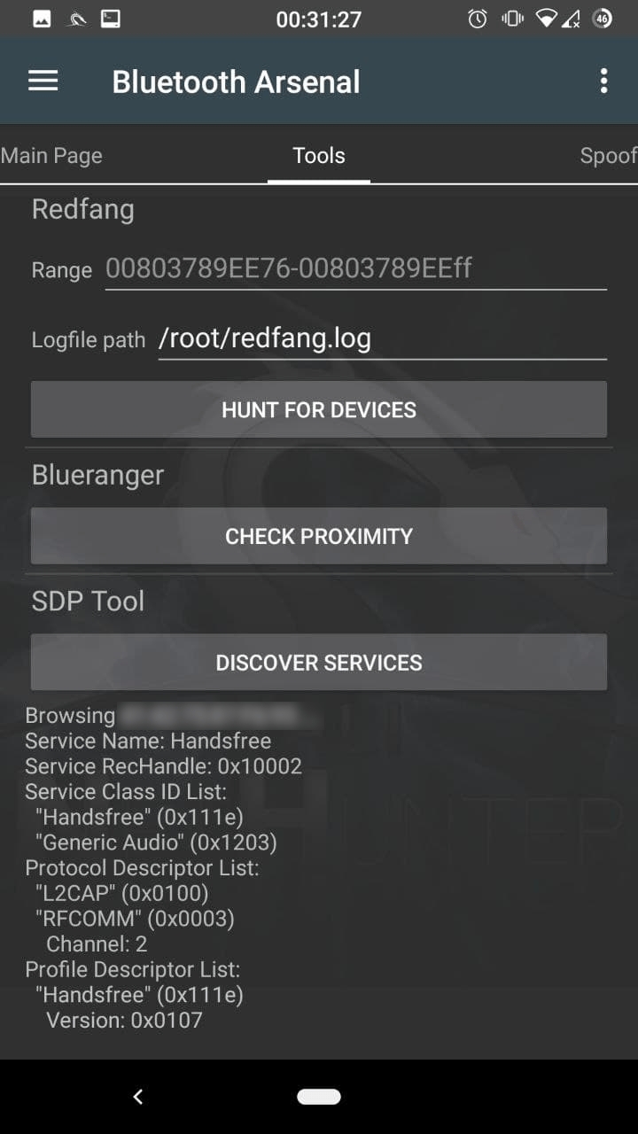 Click on the hamburger menu item and select “Bluetooth Arsenal” to open the Bluetooth menu. Here you can start & stop the services, enable the interfaces, and scan for discoverable devices. Note that devices can be also found which is not in discovery mode, using the Redfang in the next page. BLE is not supported yet.