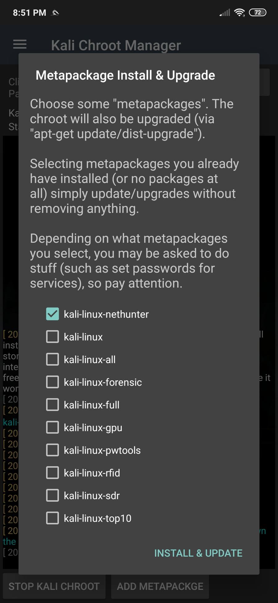 The NetHunter chroot manager allows you to download and install a Kali Linux chroot (if one does not already exist), backup and restore a chroot, as well as remove an existing chroot. In addition, one can install various Kali Linux metapackages as required.