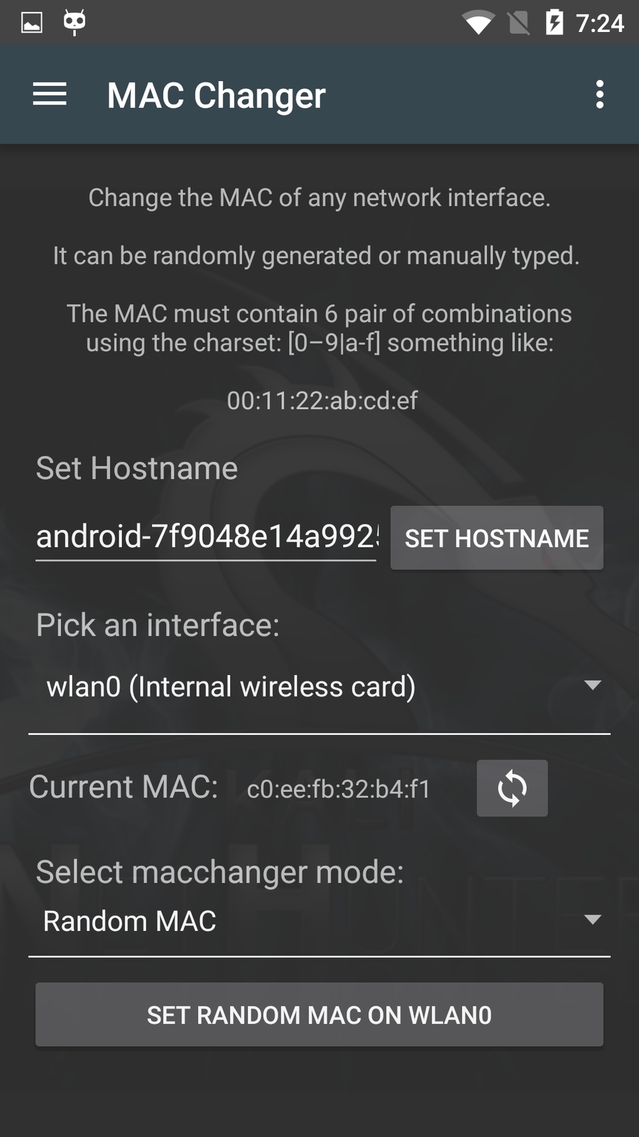 The MAC Changer pane allows you to change the MAC address of your NetHunter device network interfaces. You can choose to have the MAC address set to a random value or you can enter it manually using the standard 6-pair notation like 00:11:22:AA:BB:CC.