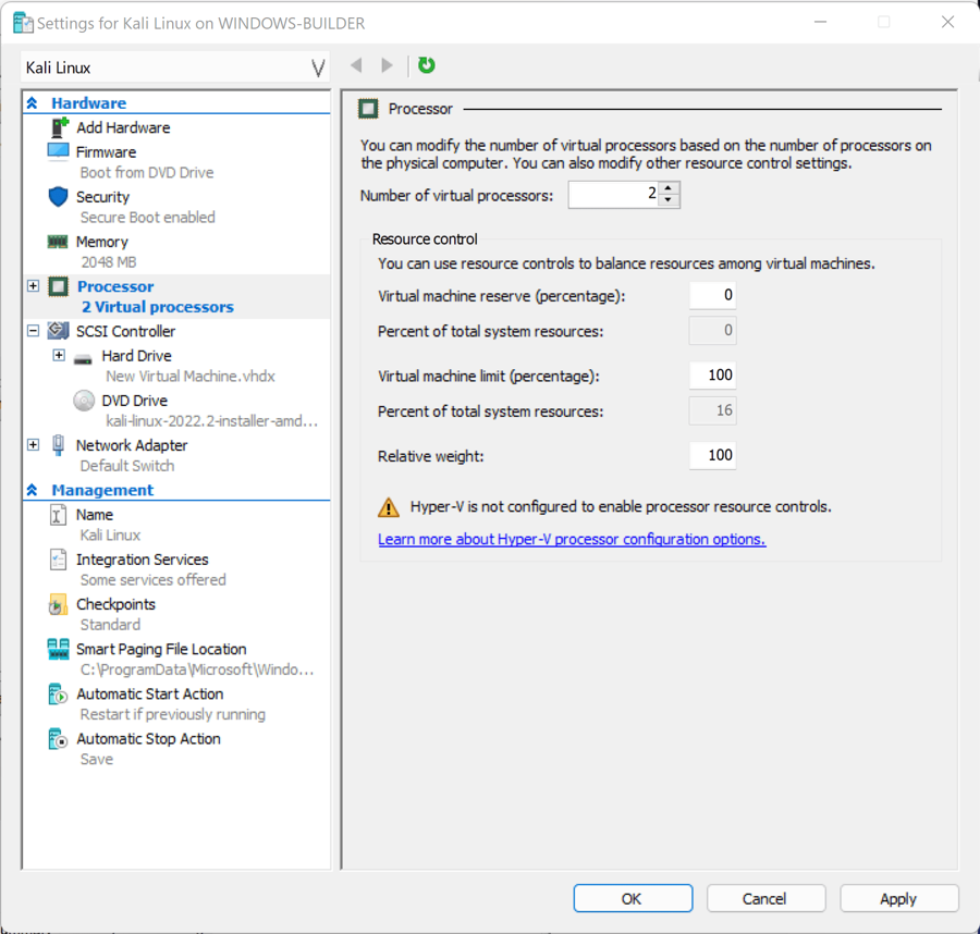 In the case of this machine, the only change needed was for the number of virtual processors. We dropped it down from 6 to 4. We are then ready to connect to our VM and continue setup like normal