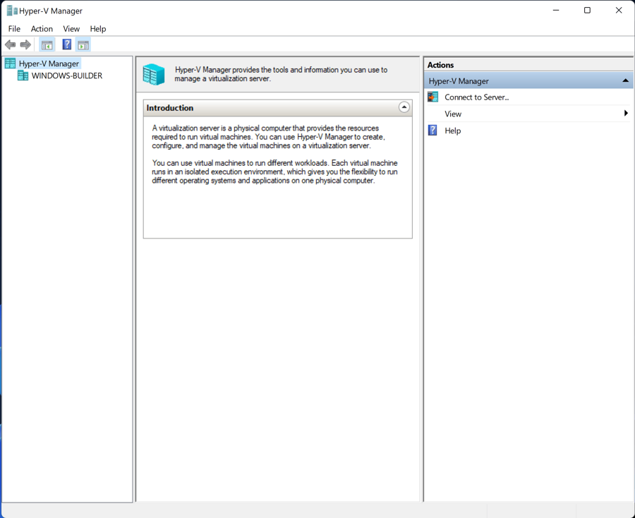 After we enable Hyper-V we can create a new VM very easily. We first need to download an installer iso. Then we can boot Hyper-V: