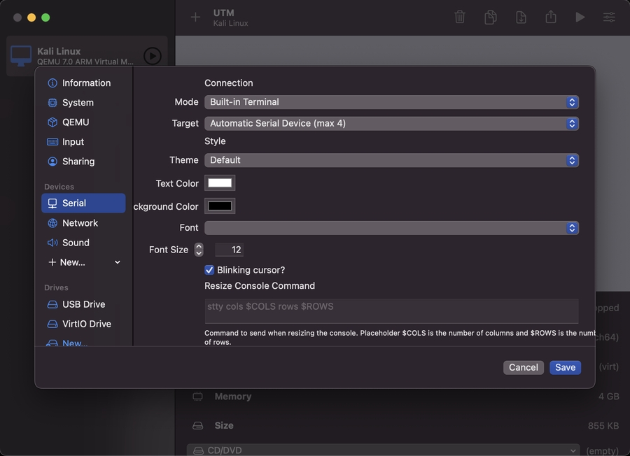 Now we are at the summary and we can re-name our VM to be “Kali Linux”. Once complete, we will hit save and then press the settings button. Due to a bug in the current UTM version, we will have to install Kali in console only mode.