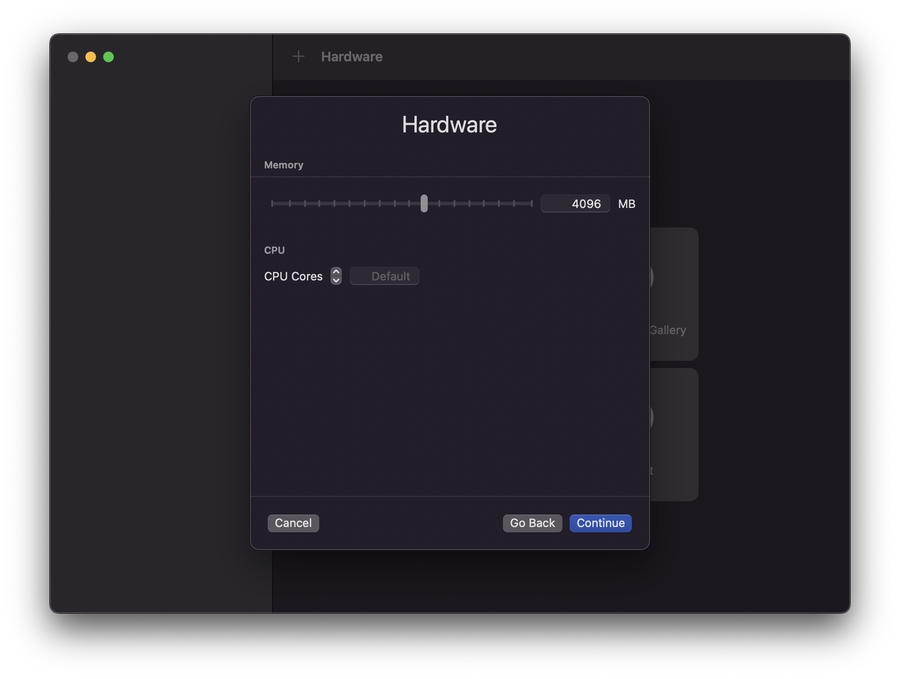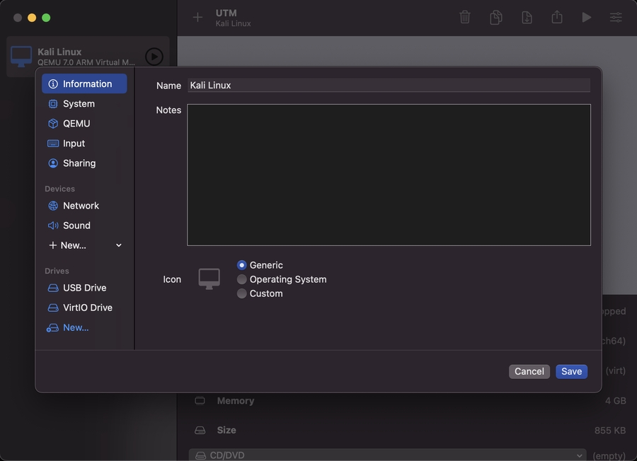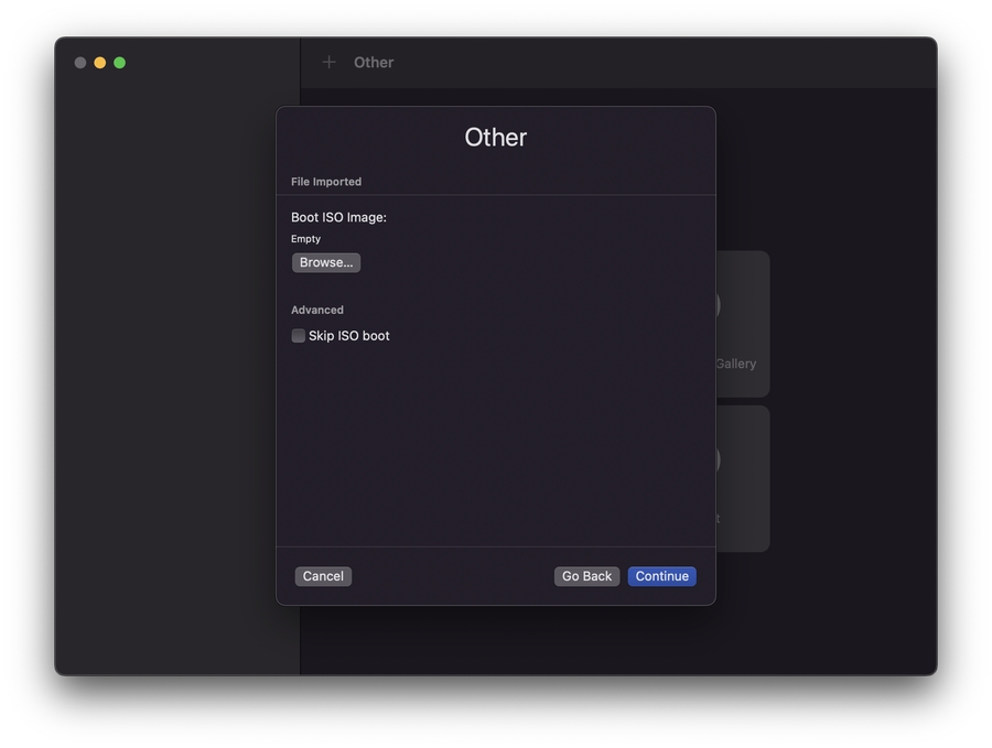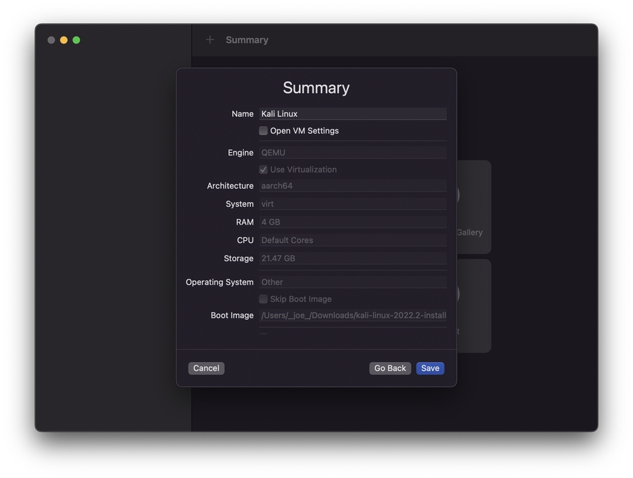 We will select Virtualize, as we will be using a Kali Apple M1 installer iso which will bring us to the next page: