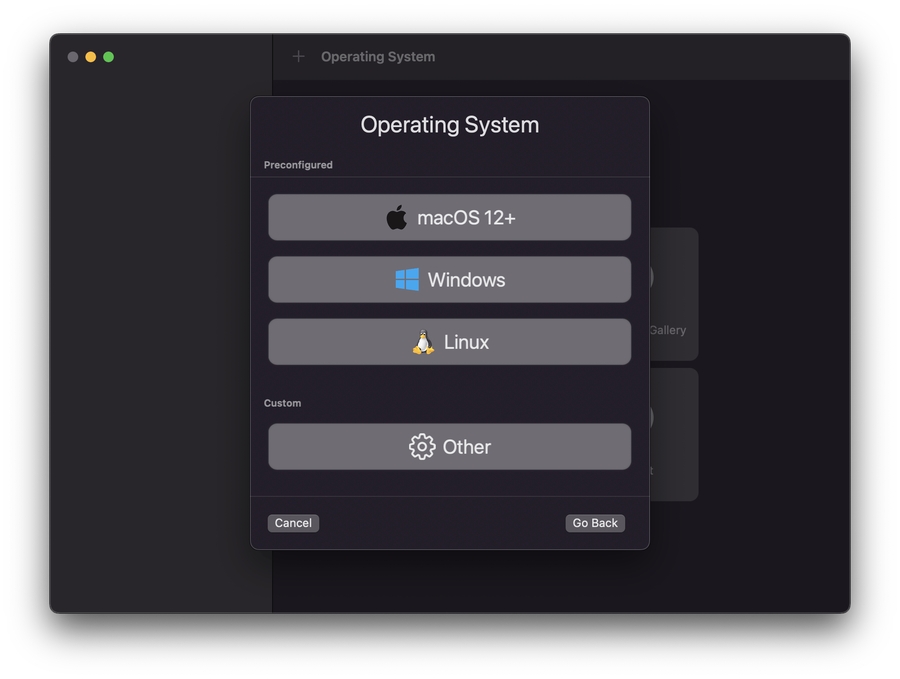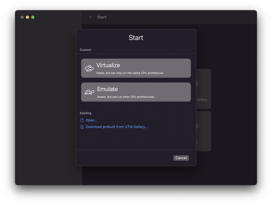 To install and set up a UTM VM it is pretty straightforward. We first download UTM and then launch the app. After this we can click create VM and start the short process: