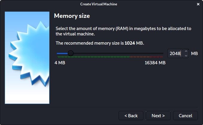 “Memory size” is the next section, where we can define how much RAM to use. Again, the higher the amount of RAM, the more applications can be open and at increased performance. Various tools inside of Kali can be demanding of resources. When we make the general VMs, we select 2048 MB (2GB) for RAM, but we often increase this for our personal machines as we have high-performing devices with spare RAM which Kali can utilize.