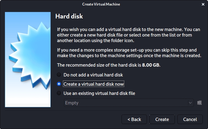 This screen below, “Hard disk”, allows us to Create a new virtual disk now.