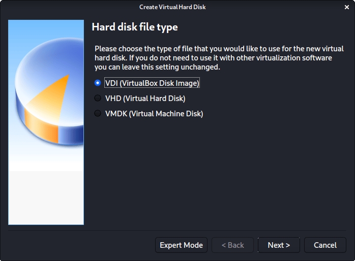 For the “Hard disk file type”, we select VDI (VirtualBox Disk Image) (and its the default option).