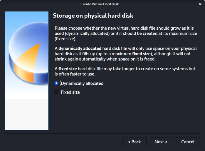 For the following screen, “Storage on physical hard disk”, we go with the default option of Dynamically allocated.