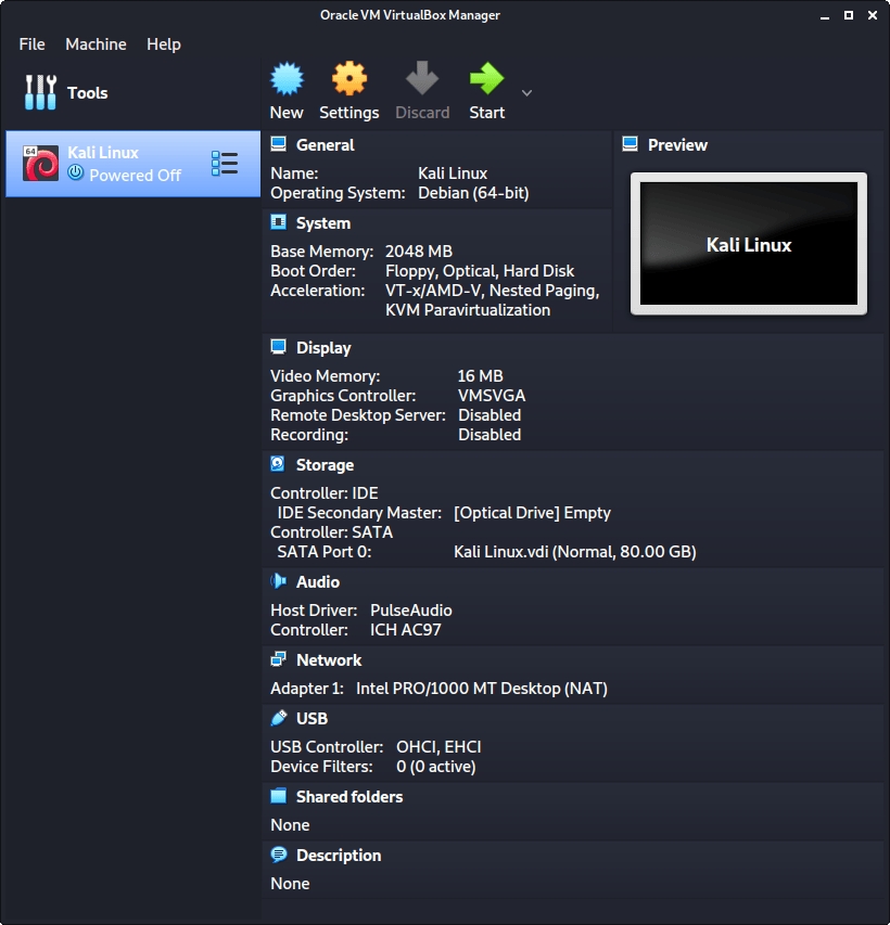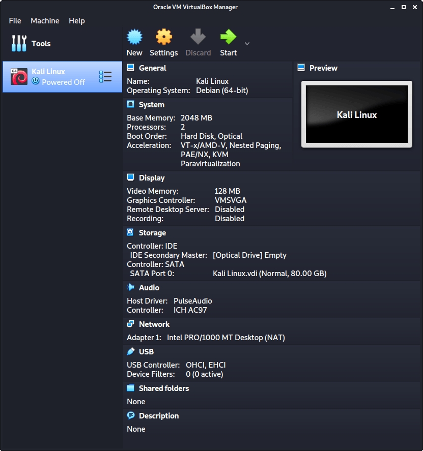 The guide below is what we use to generate our pre-made Kali Linux VirtualBox images. You may alter this to your needs. We always generate the images using the latest version of VirtualBox.