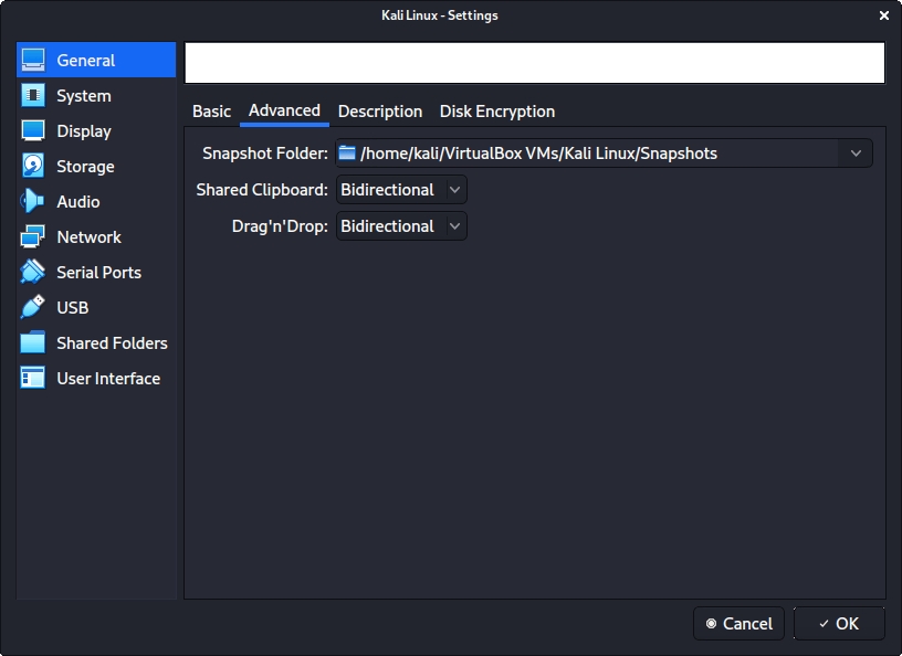 In “General” -> “Advanced”, we make sure to set “Shared Clipboard” to bidirectional, as well as “Drag’n’Drop” to bidirectional