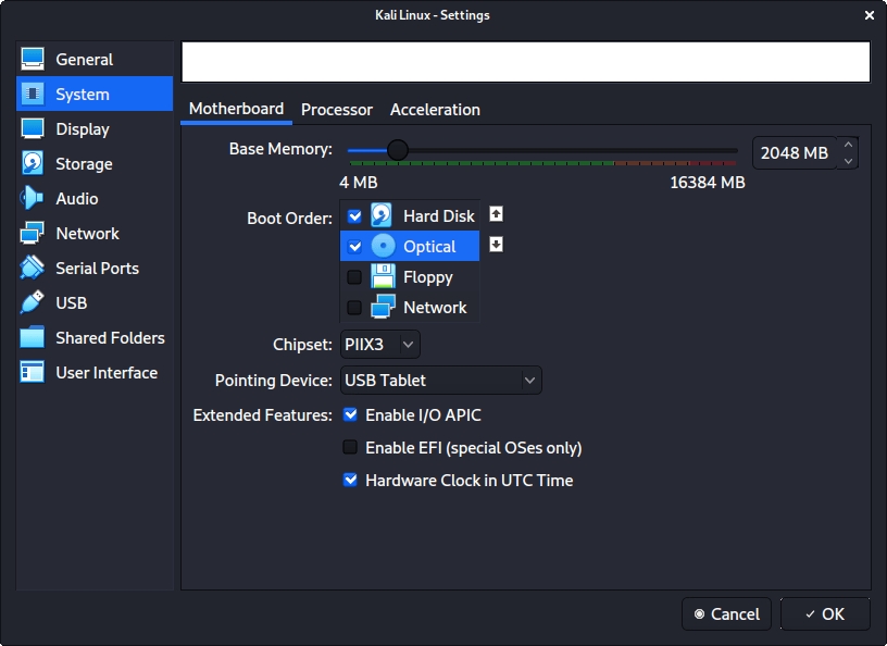 In “System” -> “Motherboard”, we change the “Boot Order” to make sure Hard Disk is top and Optical is the second. Everything else is disabled.
