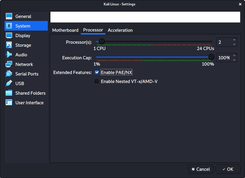 In “System” -> “Processor”, we increase the “Processor(s)” to be 2.
