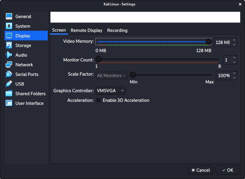 In “Display” -> “Screen”, we make sure to have “Video Memory” set to 128 MB