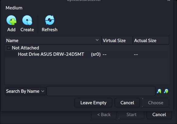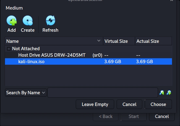 The first time we run it, we will get a prompt saying do we wish to mount an image to use as a “start-up disk”. We want to use our Kali image, rather than a physical drive, so we select the icon to the side of the drop down.