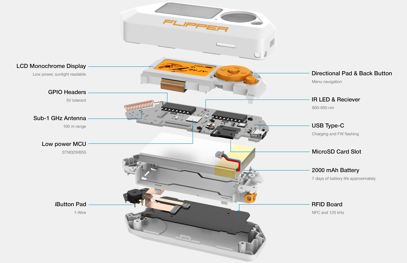 There is lots of heavy data Flipper has to store: remotes codes, signal databases, dictionaries, image assets, logs and more. All this data can be stored on an SD card, as well as user plugins.