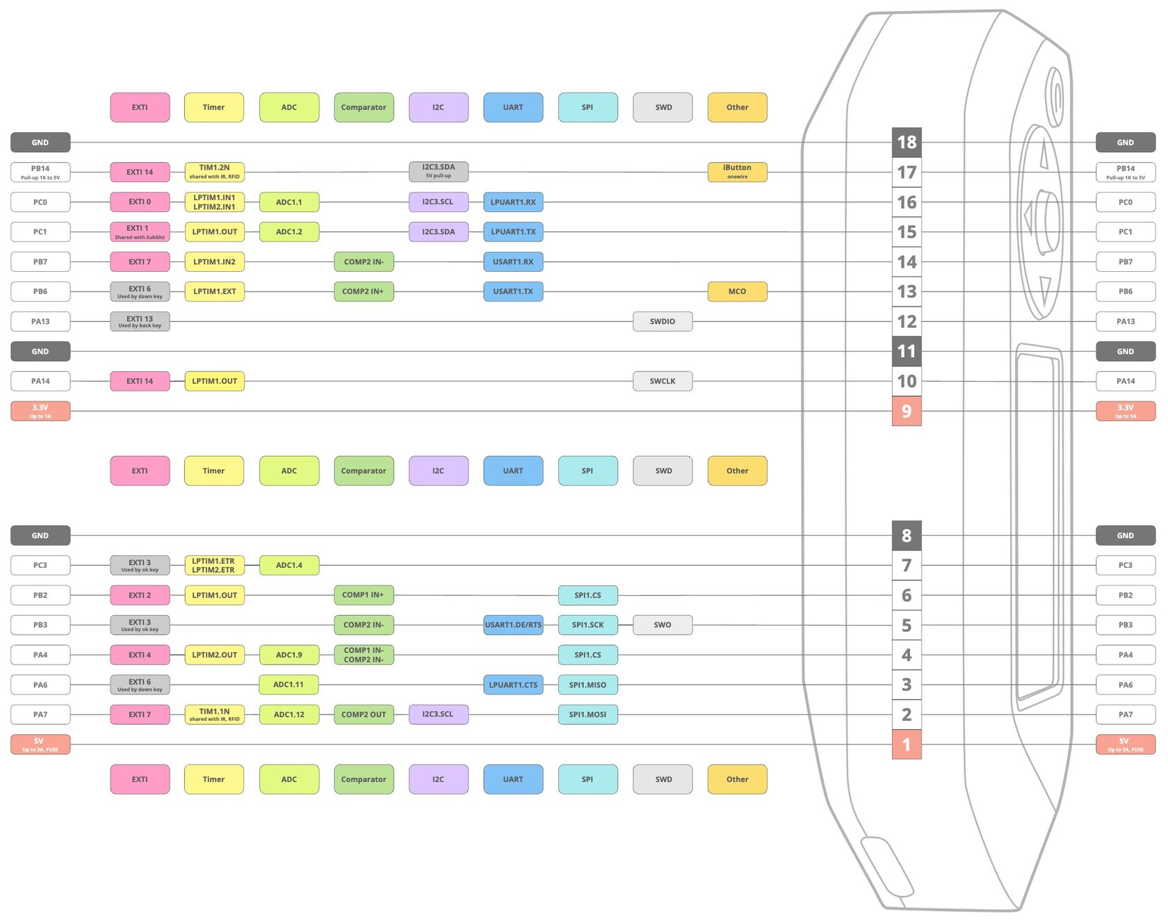 Built-in 5V and 3.3V power pins. Control from built-in buttons and display, no PC required.
